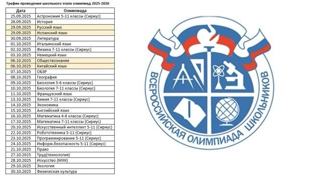 График проведения школьного этапа Всероссийской олимпиады школьников