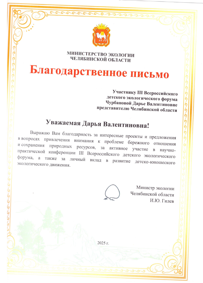 14 и 15 октября в Челябинске прошел всероссийский детский экологический форум. От нашей Гимназии в составе команды ПАО "ЧКПЗ" защищала свои проект обучающаяся 8 губернаторского инженерного класса Чурбанова Дарья. На практике она показала, что благодаря инженерному мышлению можно решить серьезные экологические проблемы.