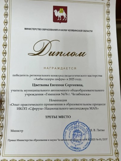 Педагог нашей гимназии Цветкова Евгения Сергеевна стала призером регионального конкурса "Амбассадоры цифры-2025. Евгения Сергеевна на практике показала технологию применения ИКОП "Сферум" на базе МАХ для достижения образовательных результатов!